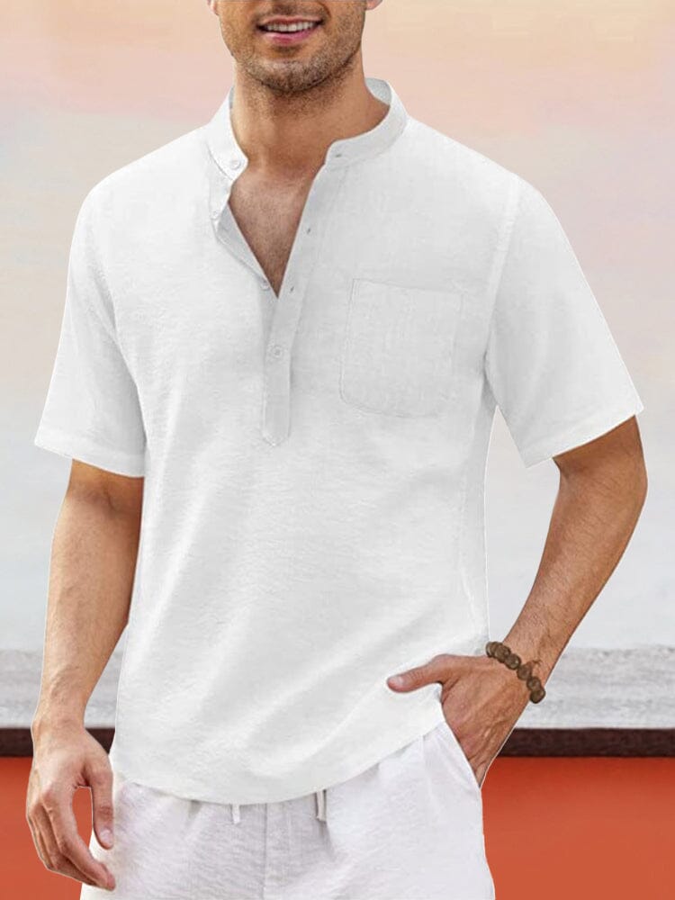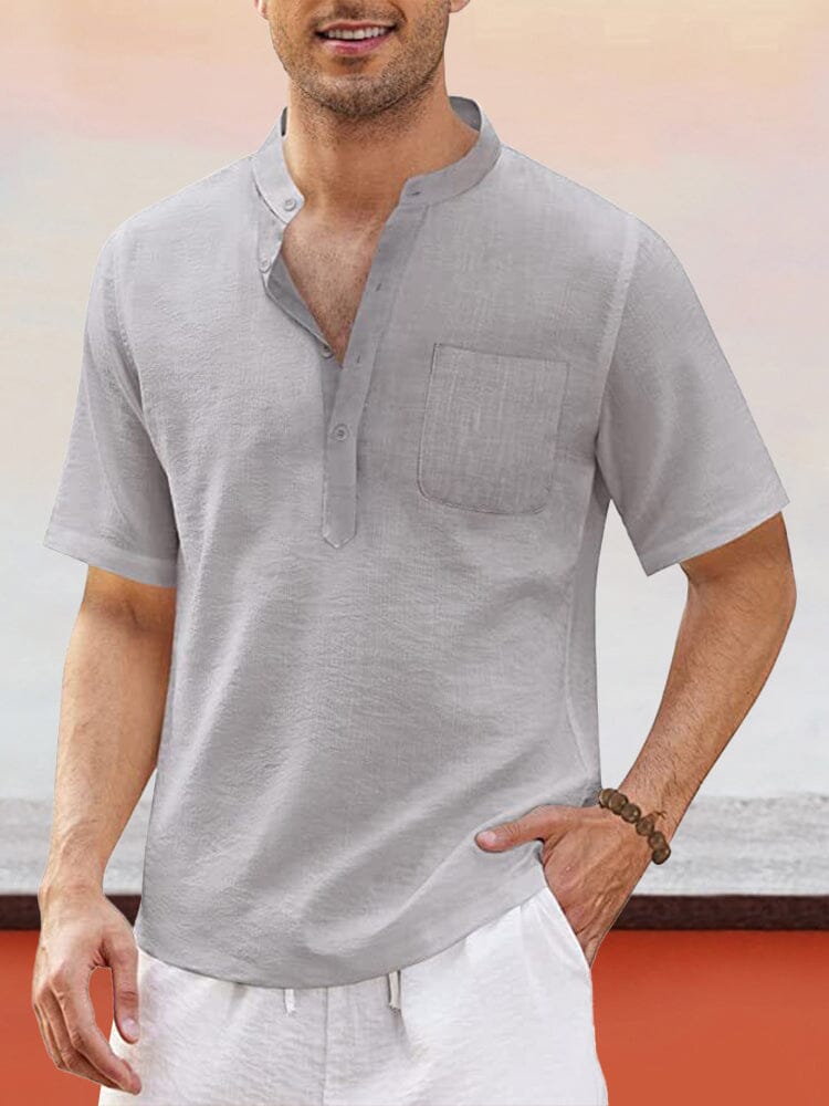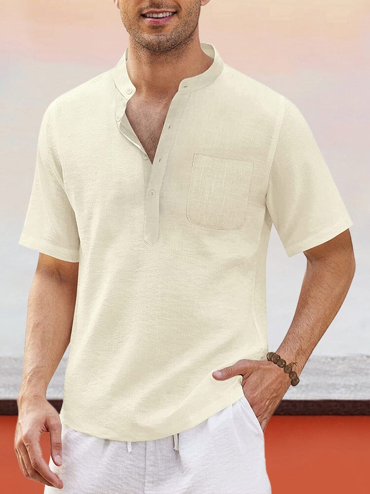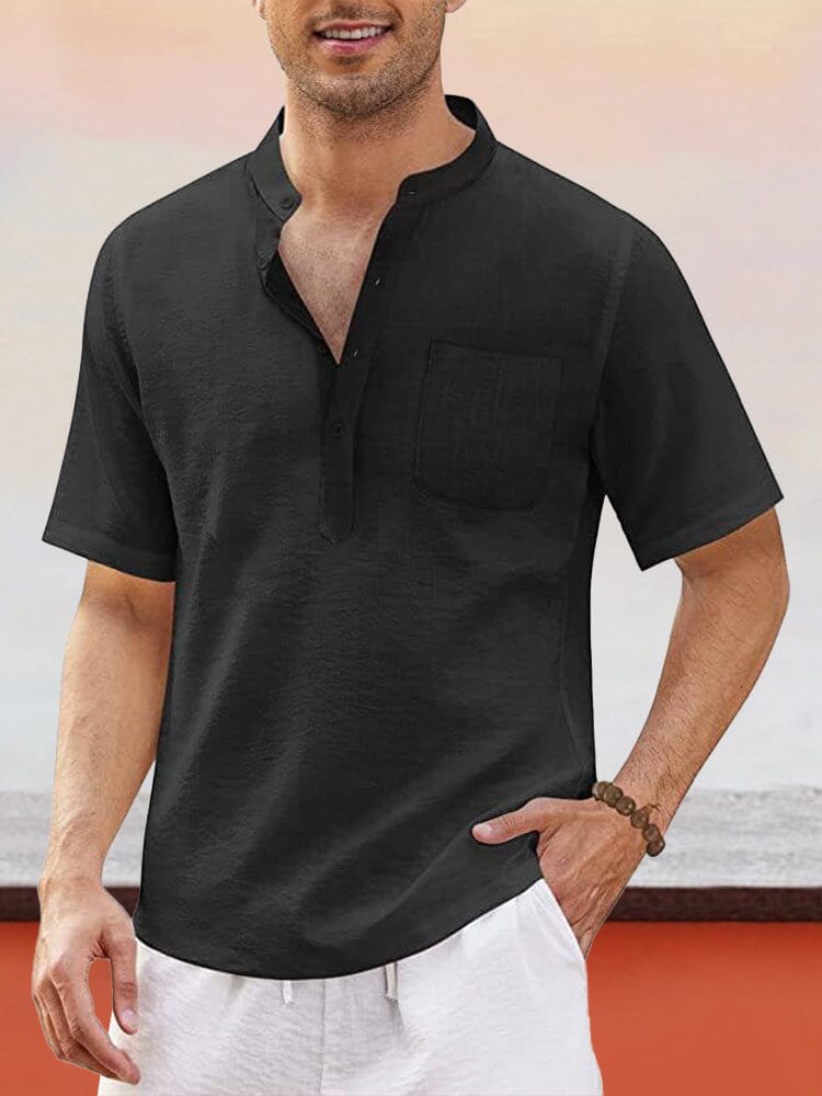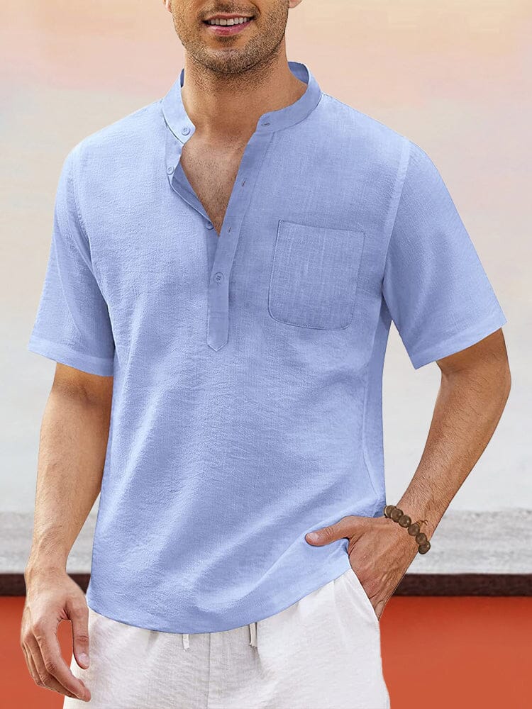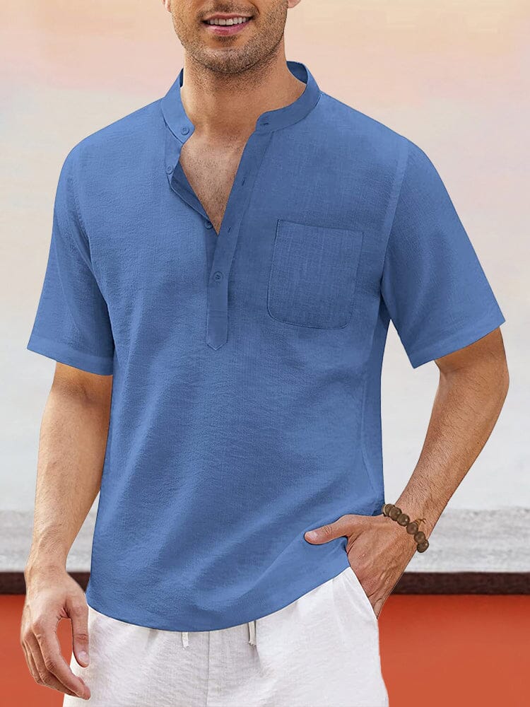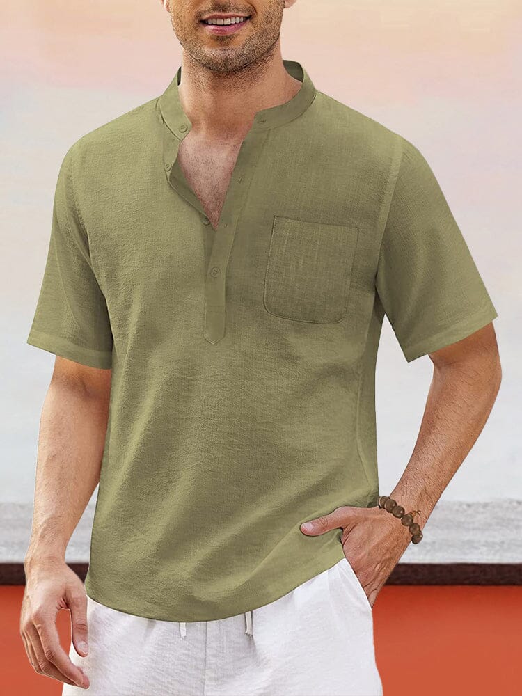 • LINEN SHIRTS FOR MEN: Lightweight shirt, casual button down shirts, short sleeve, regular fit, stand collar shirt, chest pocket, v neck, solid color, great choice for daily wearing.