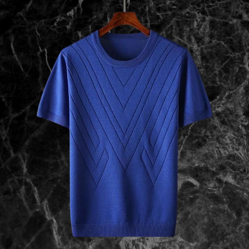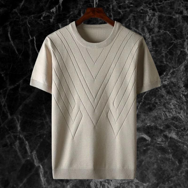 Introducing the LuxKnit Ice Silk Tee™, where high-end fashion meets ultimate comfort. This round neck knit t-shirt features an elegant jacquard pattern and is crafted from luxury ice silk, providing a cool, breathable fit perfect for the summer. Its oversized design adds a contemporary touch to a timeless piece.