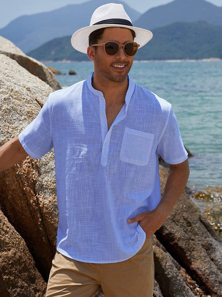 • STYLISH DESIGN:?Casual henley neck shirts, band collar, simple style, solid color, slim fit, short sleeve, button-down closure, rounded hem, featured button detail.